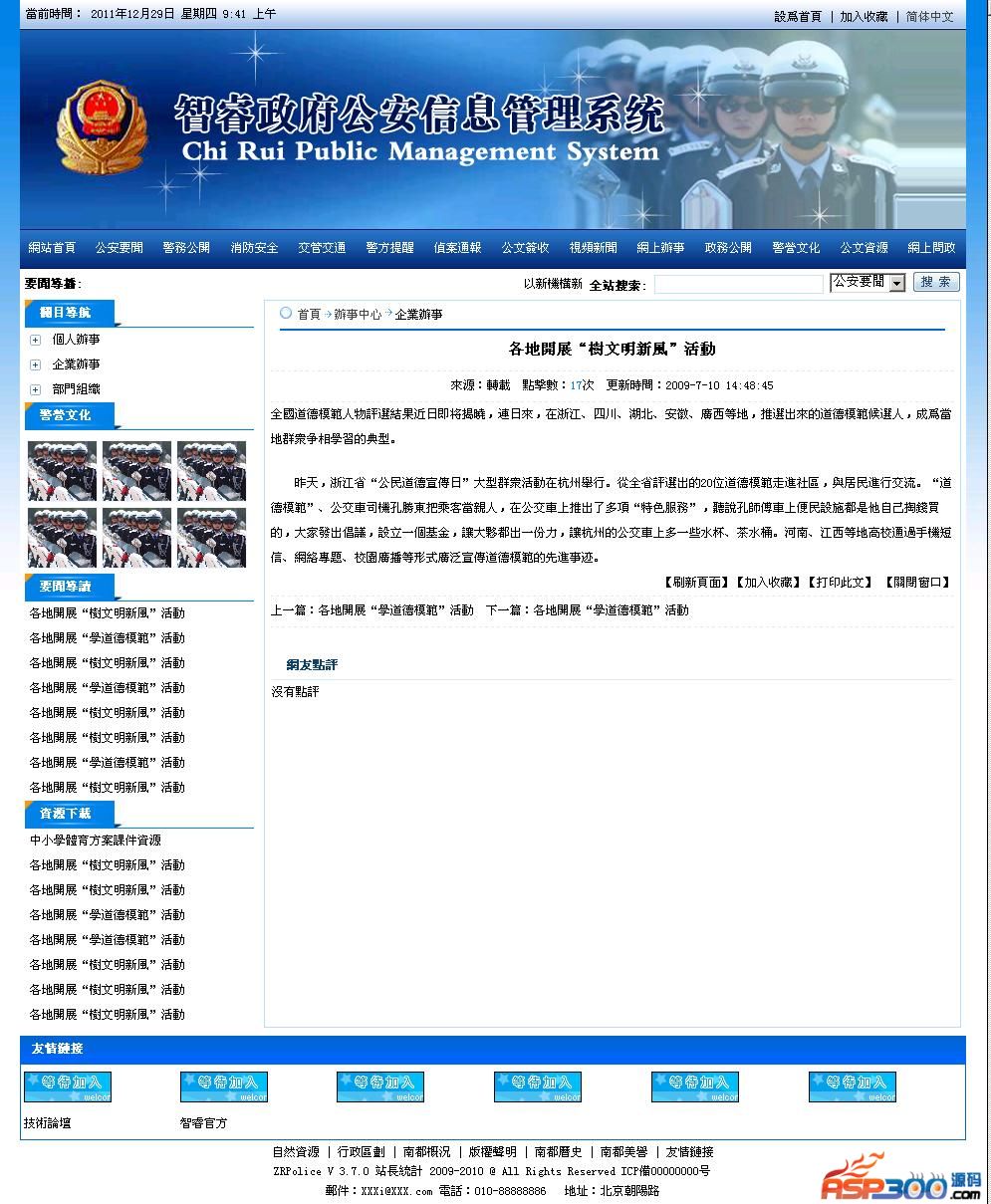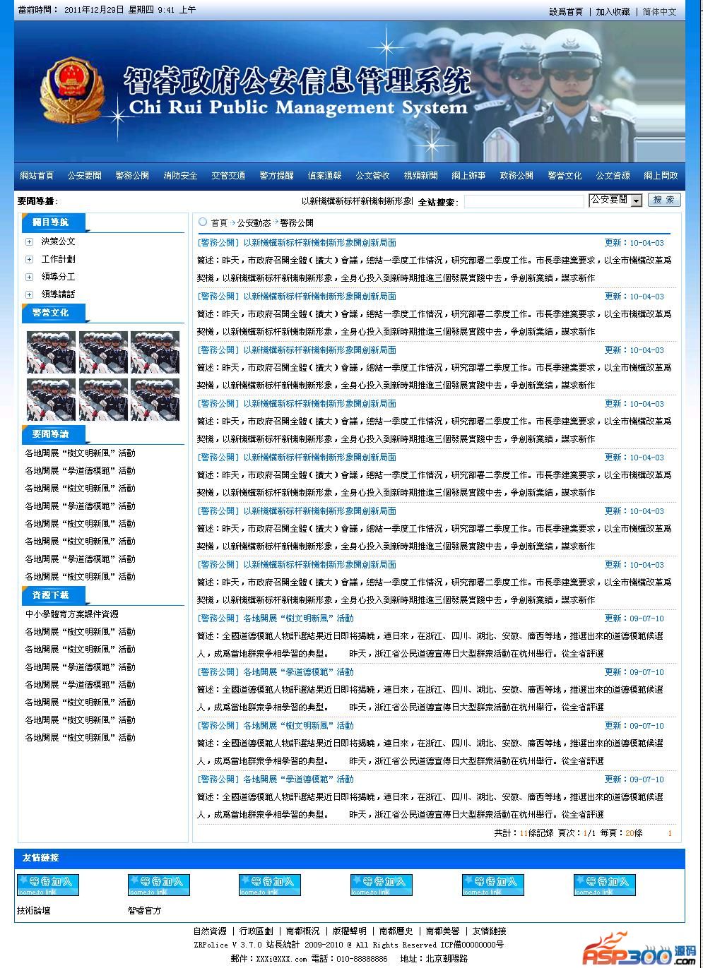 智睿公安公众信息网站系统具有强大的系统功能,拥有投票调查,视频展示、文章/新闻、公文资源、公安要闻、消防安全、交管交通、警营文化、问答/留言、友情链接、广告系统、自定义模型、自动值班系统,在线通缉系统,公文签收系统等众多丰富的功能模型。