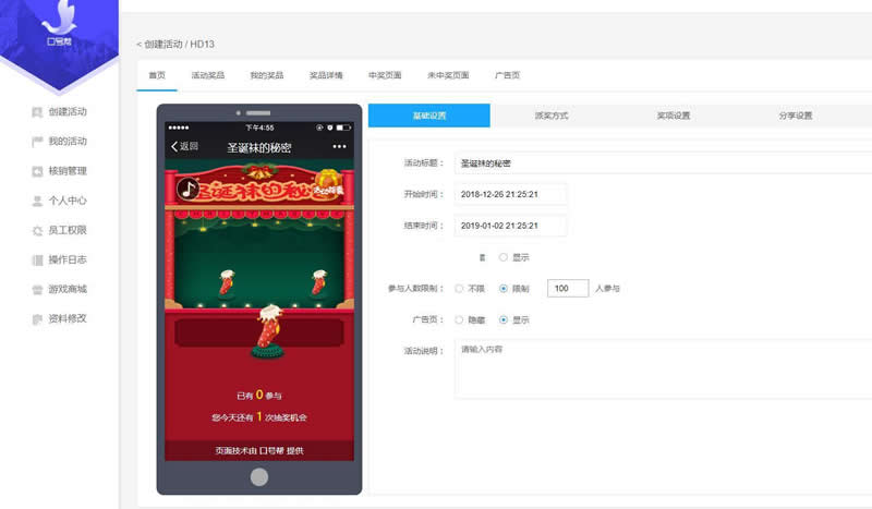 口号帮微信互动游戏营销活动抽奖DIY在线制作系统,支持微信游戏活动自定义,可以应用微信抽奖活动系统。系统可以自定义游戏名称、奖品、产品核销等功能。