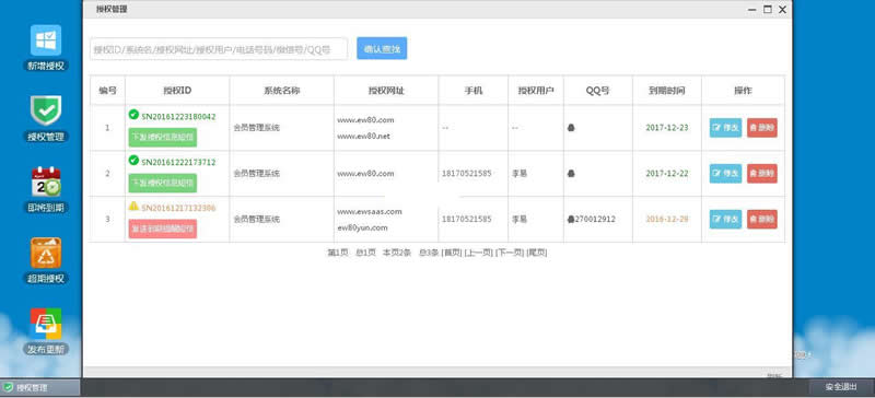 1、增加短信接口功能,可向授权用户下发授权信息短信,当用户快到期时,向用户发送到期提醒。