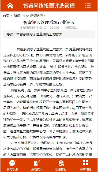 智睿手机Wap投票评选系统,针对移动端开发,适合QQ微信,手机浏览器访问。系统支持微信投票,微信关注评选系统,手机投票。并适合图文评选,适合用于大型媒体单位、机关单位、院校机构、集团公司、门户网站可用于城市评选、美景评选、优秀人物评选、活动评选,事迹评选.