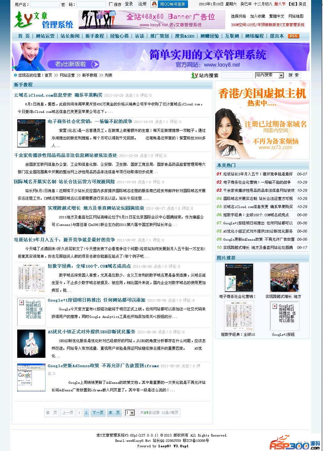 老y文章管理系统是由老y基于Asp+Access/Mssql环境下开发的开源建站产品。在很大程度上满足了初级个人用户及企业、事业单位、团体、机构等的建站需求。不需要网站操作者会复杂的程序代码,只需要轻点鼠标就能建设功能齐全的专业级网站!是初级建站首选。会员组、QQ用户登录、投票调查、评论、广告系统等功能,加强网站的互动性的同时也可为网站的发展带来一定的盈利模式。