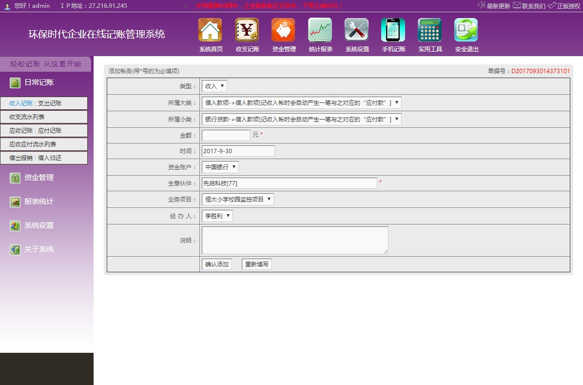 环保时代企业在线记账管理系统可以让您实时在线记账,并可以通过智能手机客户端同步记账、查账,无论您走到哪里都可以及时记账、查账。