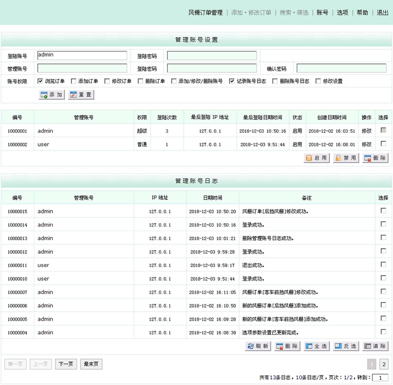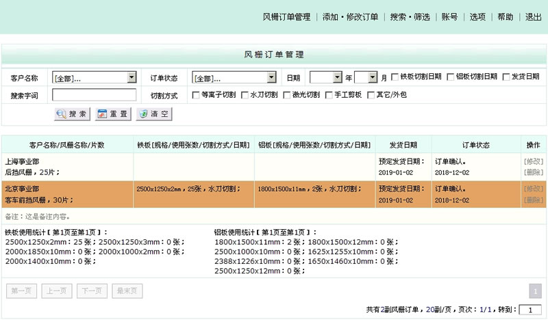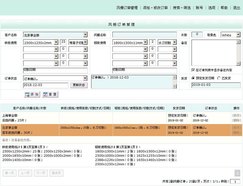 一款风栅订单管理系统,设计这套系统,只为方便公司内部使用。可以添加多个管理账号,同时多人登陆操作。添加/修改订单,添加/统计材料的使用记录(默认可以添加2种材料的使用和统计,每种材料可以添加使用4种不同的规格、使用张数,切割方式),制作过程中,随时更改订单状态。搜索/筛选订单。在订单列表,自动统计2种不同规格的材料的使用张数。